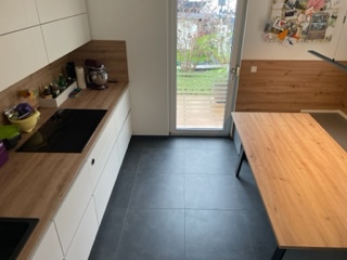 Der Kunde hat sich hier für Fliesen in Betonoptik im Format 60x60cm entschieden. Ein beliebtes Format für Wand- und Bodenfliesen, das sich mittlerweile als Standardgröße etabliert hat und Räumen einen modernen großzügigen Look verleiht. Die hier verlegten hochwertigen Fliesen in ästhetischer Betonoptik strahlen Behaglichkeit aus und verleihen jedem Raum eine edle Atmosphäre. Dank ihres zeitlosen Designs sind sie vielseitig kombinierbar und wirken hier besonders harmonisch im Zusammenspiel mit den vom Kunden selbst installierten Küchenmöbeln in Weiß und den Arbeitsplatten in Holzoptik.